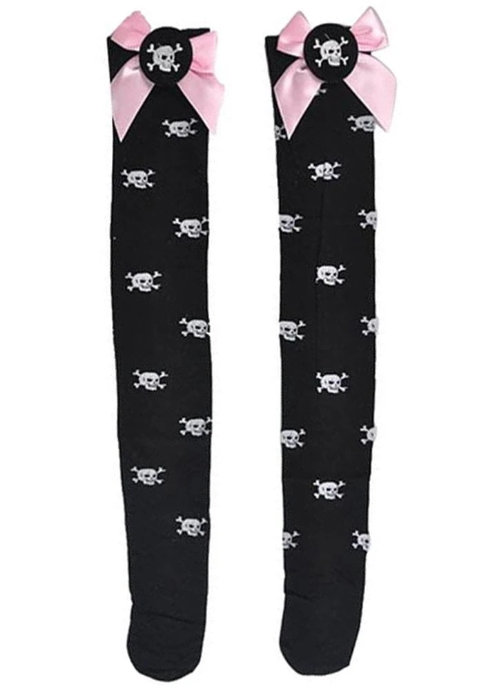 These Skull & Crossbones Bow Stockings are a pair of cute over the knee socks. They feature a white skull and crossbones design with pink satin bow at the top with a skull and crossbones centrepiece.