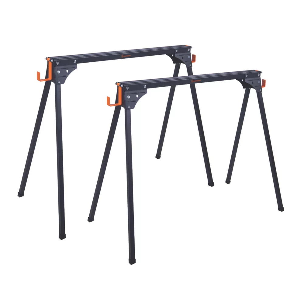 Durable steel sawhorse trestles for lasting reliability. Features non-marking, rubberised feet. Support brackets offer space for 45 x 95mm lengths of timber.