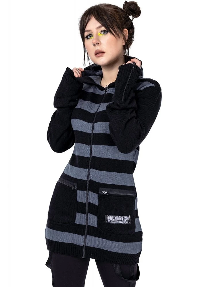The Long Goblin Top from Poizen Industries is a cosy grey and black striped hoodie. The gothic hoodie has contrast black sleeve with zip details, a zip front and pockets with logo detail.