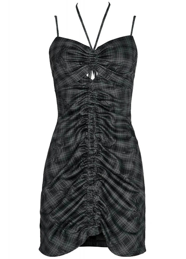 Punk Rave’s Ruched To Thrill Dress is a grey and black checked dress with flocked angels. The dress has adjustable straps with a halterneck tie and ruched front and bust.