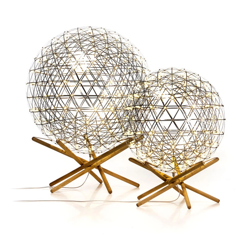 Inspired by the principle of “tensegrity” (tensional integrity, floating compression), Raimond Tensegrity embodies a perfect balance between push & pull forces. A giant LED sphere appears to hover above its aerial wood stand with ethereal grace. It was a dream of its designer that it may stand in a space where people might marvel at this sparkling wonder, reach out for the stars & wow!