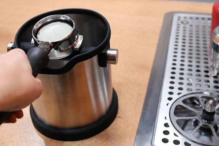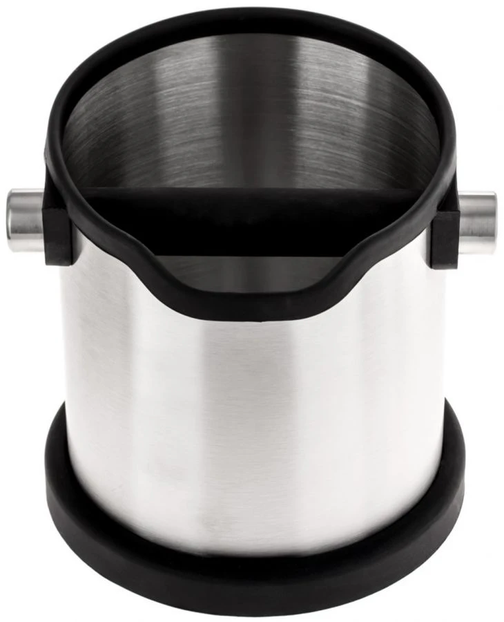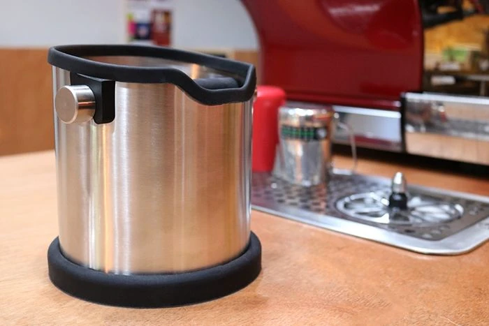 The knock box has a non-slip silicone base that keeps it steadily in place even when taking a heavy beating. The knock box also has a silicone collar that protects the portafilter when your aim is a bit off.