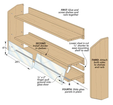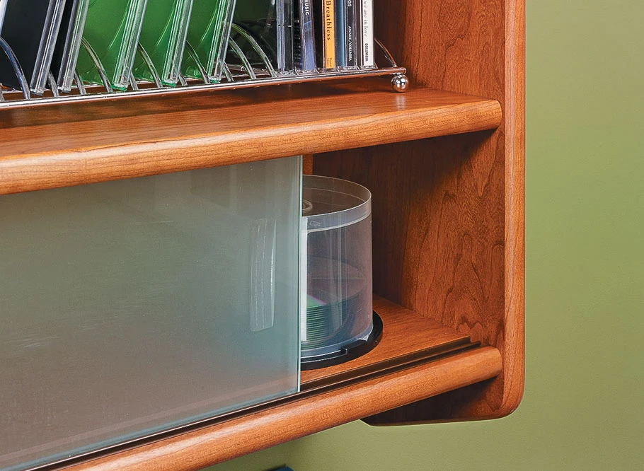 This shelf adds storage space to any home and doesn’t take up valuable floor space. It hangs on the wall, so you can place it over a desk or buffet. And that gives you more room to stash books or other items. As you can see in the photos, this shelf has sliding glass doors that add to the overall design. The frosted-glass doors slide in a track and conceal the clutter. You’d think that building a sturdy wall shelf would require a lot of complicated joinery. But that’s not the case. We used Minifix fasteners. The two-part fasteners draw the workpieces together and hold them firmly. This means you can simply cut the pieces to size and not worry about cutting a lot of complicated joinery to assemble the project.