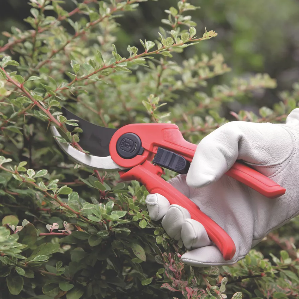 Suitable for live or green stems. Hardened PTFE-coated carbon steel blades for rust resistance and contoured ergonomic handles for a comfortable grip. Extra-large safety thumb catch allows easy unlocking and locking.
